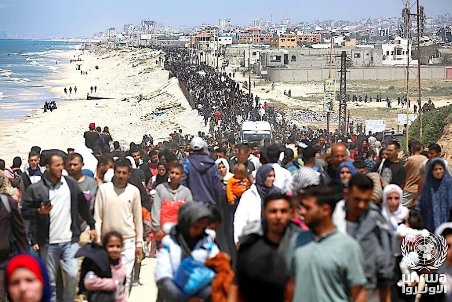En avril 2024, des personnes déplacées tentent de regagner le nord de la bande de Gaza en traversant le pont qui enjambe l’estuaire du Wadi Gaza. (Ashraf Amra / Office de secours et de travaux des Nations Unies pour les réfugiés de Palestine dans le Proche-Orient / CC BY-SA 3.0 igo)