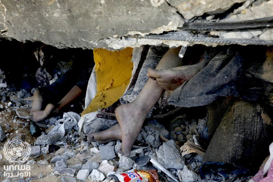 Palestiniens sous les décombres en 2023 après un raid aérien israélien sur des maisons dans la bande de Gaza. (Ashraf Amra /Office de secours et de travaux des Nations Unies pour les réfugiés de Palestine dans le Proche-Orient / Wikimedia Commons /CC BY-SA 4.0)